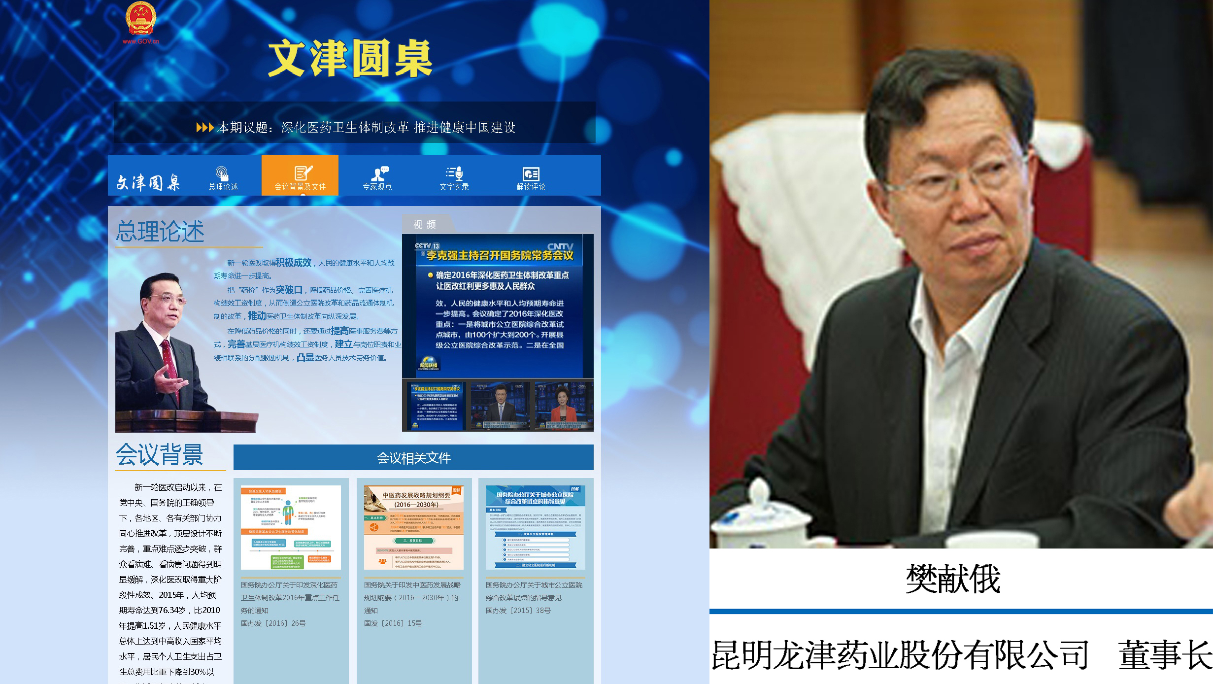 昆明龍津藥業(yè)股份有限公司董事長(zhǎng)樊獻(xiàn)俄參加中國(guó)政府網(wǎng)2016年05月26日舉行的閉門圓桌會(huì)議并闡述了“藥品質(zhì)量及監(jiān)管”的精辟觀點(diǎn)。